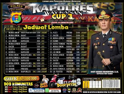 WAY KANAN, LAMPUNG – Polres Way Kanan kembali menggelar lomba burung kicau Kapolres Cup III yang akan dilaksanakan dilapangan Mako polres setempat pada Minggu, 08 Desember 2024. AKBP Adanan Mangopang saat dikonfirmasi awak media Rabu,… Sukses Pilkada 2024, Polisi Ajak Kicau Mania Meriahkan Kapolres Way Kanan Cup 3