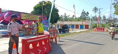 Lampung Barat – Anggota Koramil 422-04/Balik Bukit Kodim 0422/Lampung Barat Serka Suntami Sosialisasikan Pemberlakuan Pembatasan Kegiatan Masyarakat (PPKM) kepada masyarakat dan himbauan larangan mudik menjelang hari raya Idul Fitri yang betempat di Pos Penyekatan pekon pagar dewa Kecamatan Sukau, Kab Lampung Barat, Sabtu (07/05)