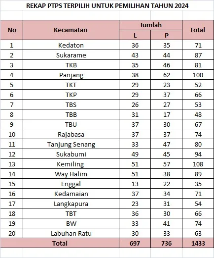 Penanggung Jawab rekrutmen tersebut, Koordiv SDMO Juwita mewakili Ketua Bawaslu Kota Bandar Lampung Apriliwanda SH menjelaskan bahwa total PTPS terpilih untuk menjamin Demokrasi bersih pada Pilkada tahun 2024 ini telah melalui berbagai tahapan seleksi.