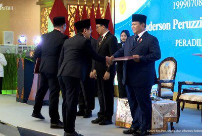 Presiden Prabowo Subianto menyerahkan surat keputusan (SK) kepada para hakim saat menghadiri acara pengukuhan hakim di Mahkamah Agung (MA) Jakarta pada Kamis (12/6/2025). Foto: Youtube/Sekretariat Presiden