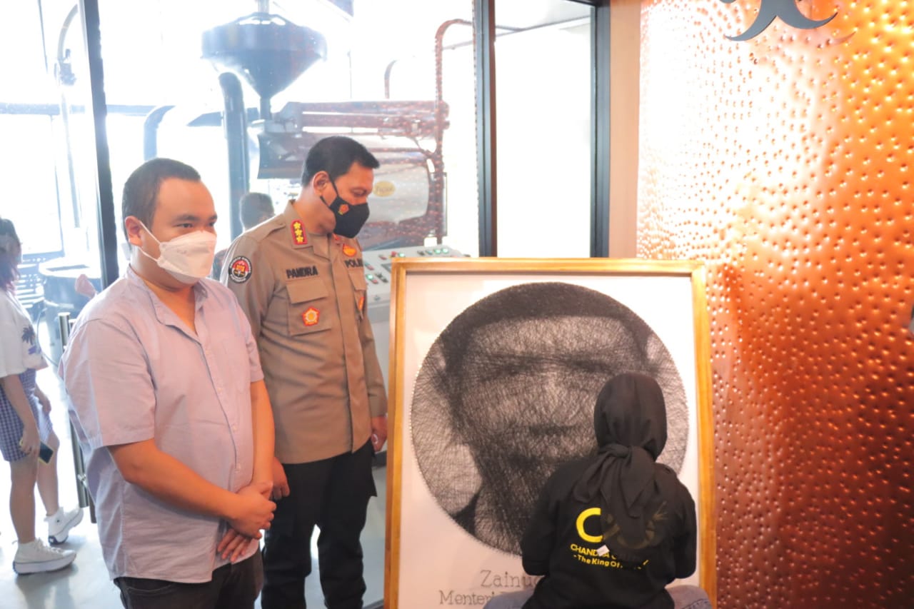 BANDAR LAMPUNG — Kabid Humas Polda Lampung Kombes Pol Zahwani Pandra Arsyad, menghadiri undangan pameran ‘String Art’ hasil karya anak anak penyandang disabilitas Bandar Lampung di E’ls Coffee Roustery bypass Bandar Lampung, pada Rabu pagi (6/10/2021).