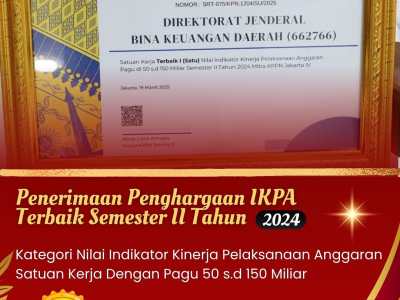 Dalam kegiatan yang digelar oleh Kantor Pelayanan Perbendaharaan Negara (KPPN) Jakarta IV, Ditjen Bina Keuda berhasil mempertahankan prestasi tahun sebelumnya sebagai satuan kerja dengan Indikator Kinerja Pelaksanaan Anggaran (IKPA) Terbaik untuk kategori pagu anggaran Rp50 hingga 150 miliar Lingkup KPPN Jakarta IV Tahun 2024 yang menduduki peringkat pertama.