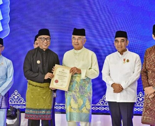 JAKARTA – Gubernur Lampung Rahmat Mirzani Djausal menerima anugerah Tun Perak dari Dunia Melayu Dunia Islam (DMDI) dalam acara Konvensyen DMDI Ke-23 di Hotel Borobudur Jakarta, Jum’at (24/10/2025).