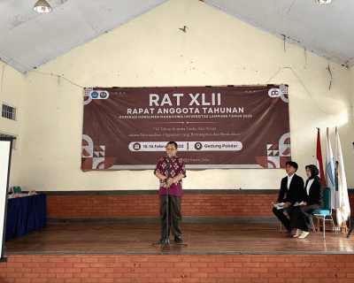 Lampung – Koperasi Konsumen Mahasiswa (Kopma) Universitas Lampung (Unila) mengadakan Rapat Anggota Tahunan (RAT) dengan mengusung tema, “42 Tahun Kopma Unila: Aksi Nyata dalam Mewujudkan Organisasi yang Berintegritas dan Berdedikasi” pada 15-16 Februari 2025 di Gedung Pokdar Mitra Kamtibmas, Polresta Bandar Lampung.