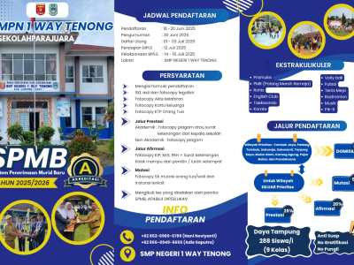 Lampung Barat – SMP Negeri 1 Way Tenong resmi membuka pendaftaran bagi calon peserta didik baru untuk Tahun Ajaran 2025/2026. Sekolah ini mengundang putra-putri terbaik untuk bergabung dan tumbuh bersama dalam lingkungan pendidikan yang berkualitas dan berorientasi pada prestasi masa depan.