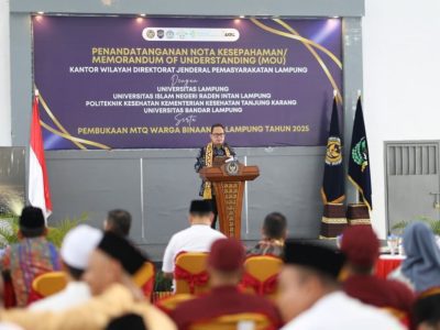 LAMPUNG – Universitas Lampung (Unila) turut berperan aktif dalam penandatanganan Nota Kesepahaman (MoU) kerja sama dengan Kantor Wilayah Direktorat Jenderal Pemasyarakatan Lampung, yang dirangkai dengan pembukaan Musabaqah Tilawatil Quran (MTQ) Warga Binaan Pemasyarakatan se-Lampung Tahun 2025.