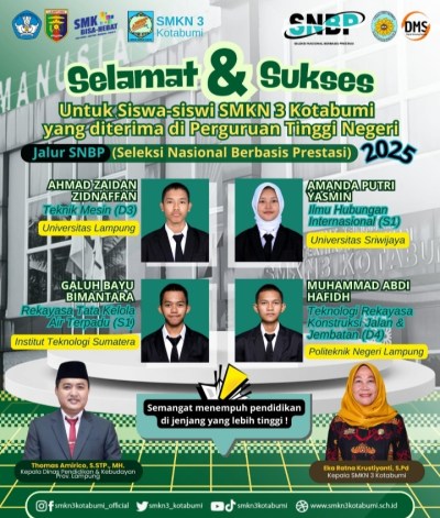 “Semoga prestasi ini dapat memicu dan memotivasi siswa lainnya sehingga tahun depan akan semakin banyak siswa SMKN 3 Kotabumi diterima di perguruan tinggi melalui jalur SNBP (Seleksi Nasional Berbasis Prestasi),”. Kata Armalis