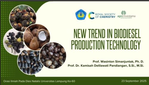 Orasi tersebut berlangsung Selasa, 23 September 2025, bertempat di Gedung Serbaguna (GSG) Unila. Dalam paparannya, Prof. Wasinton menegaskan pentingnya pengembangan energi terbarukan, khususnya biodiesel, sebagai solusi atas keterbatasan energi fosil dan dampak lingkungan yang ditimbulkannya.