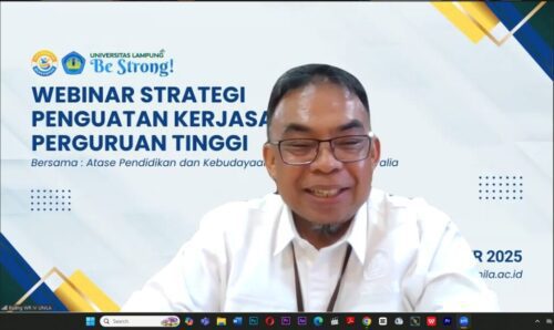 Lampung – Universitas Lampung (Unila) menggelar webinar bertajuk “Peluang Kolaborasi Indonesia dan Australia” sebagai langkah strategis dalam memperkuat kerja sama perguruan tinggi. Kegiatan yang diinisiasi Bidang Kerja Sama Unila ini berlangsung pada Rabu, 15 Oktober 2025, secara daring melalui platform zoom meeting.
