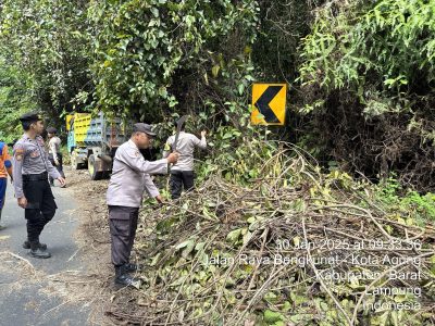 PESISIR BARAT – Polsek bengkunat gerak cepat evakuasi pohon yang tumbang yang melintang di tengah jalan lintas hutan kawasan Hutan TNBBS kec.bengkunat kab.Pesisir barat,Kamis,(30/1/2025.)